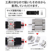 | 付属品 | ベルトを拭くクロス アップルウォッチバンド調整工具 交換用アダプター 専用ボックスに入れてお届けいたします。 ベルト調整工具付きでご自身でベルトのサイズ調整可能です。 調整するのが難しいお客様はお近くの時計店で調整することをおすすめ致します。 ステンレススチールのバンド調整は時計店で1,500円ほどの費用が発生しますがご自身で簡単に調整できるように、今回はサイズ調整用の工具が付属致します。 アップルウォッチ部分はスライドで簡単に取り付け可能なので届いたその日から交換対応可能となっています。 |