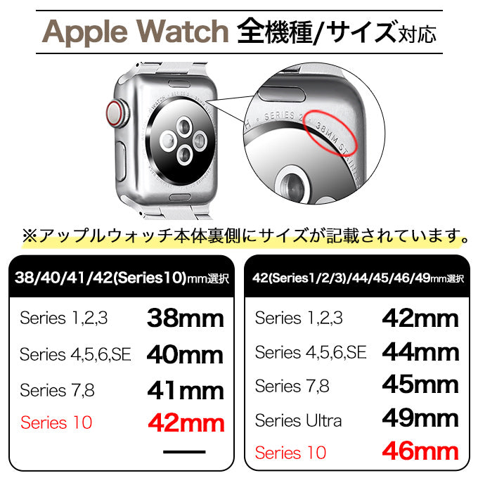 | 対応サイズ | アップルウォッチ 38mm アップルウォッチ 40mm アップルウォッチ 41mm アップルウォッチ 42mm(Series10) アップルウォッチ 42mm(Series1/2/3) アップルウォッチ 44mm アップルウォッチ 45mm アップルウォッチ 46mm アップルウォッチ 49mm |